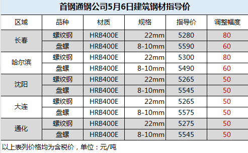 新干線訊 5月6日,首鋼通鋼公司對建筑鋼材指導(dǎo)價進(jìn)行調(diào)整如下: