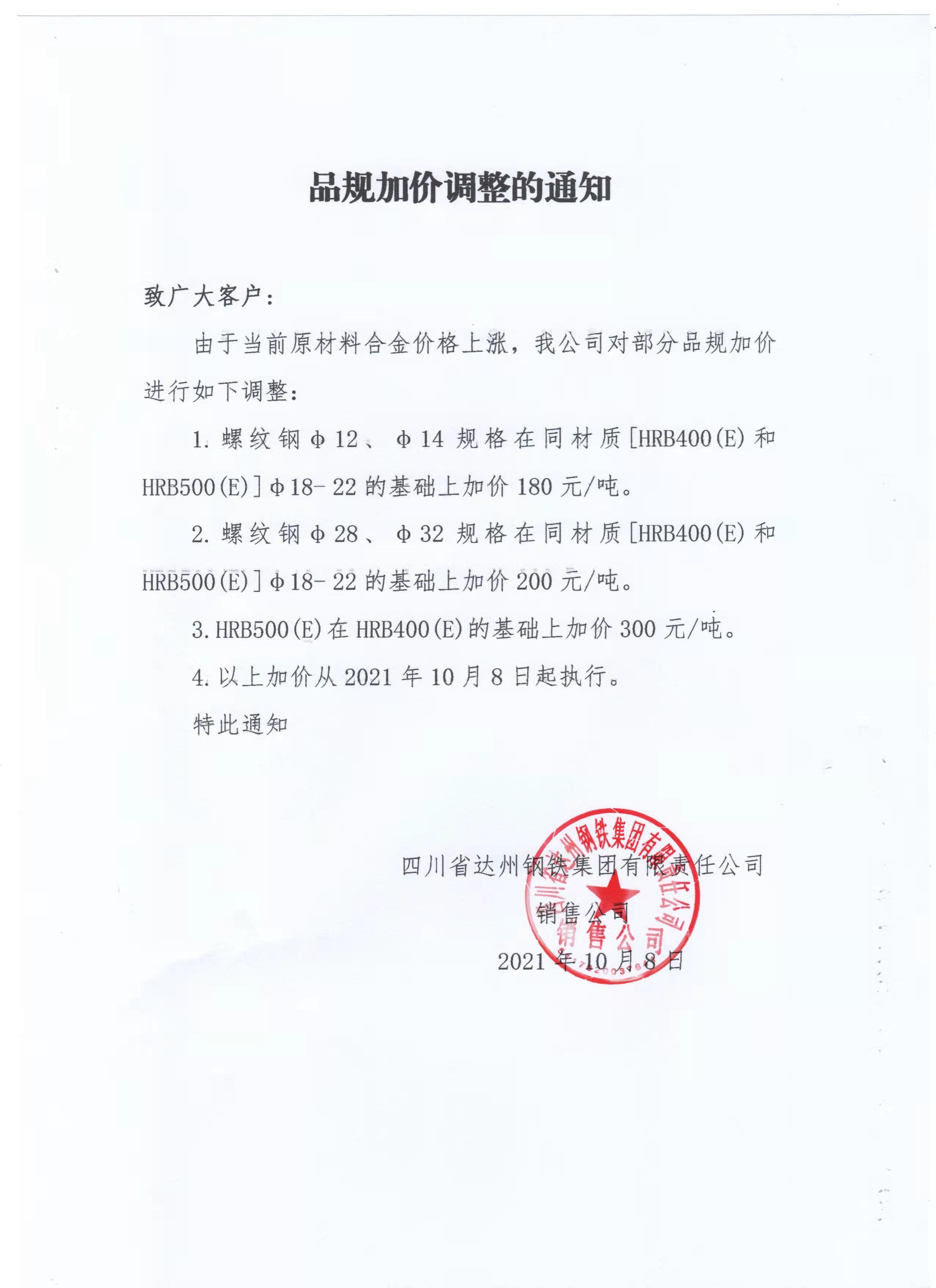 西本訊 10月8日,達(dá)鋼對(duì)螺紋鋼規(guī)格加價(jià)調(diào)整信息如下: