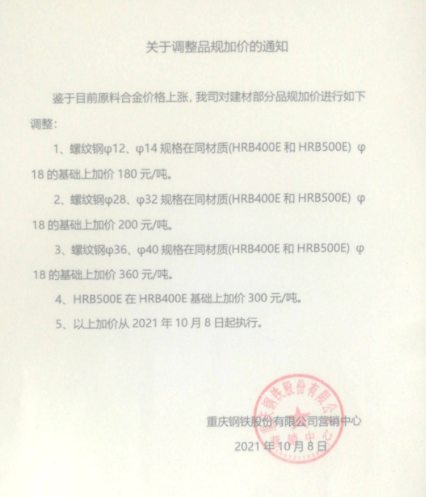 西本訊 10月8日,重鋼螺紋鋼組距加價(jià)調(diào)整如下: