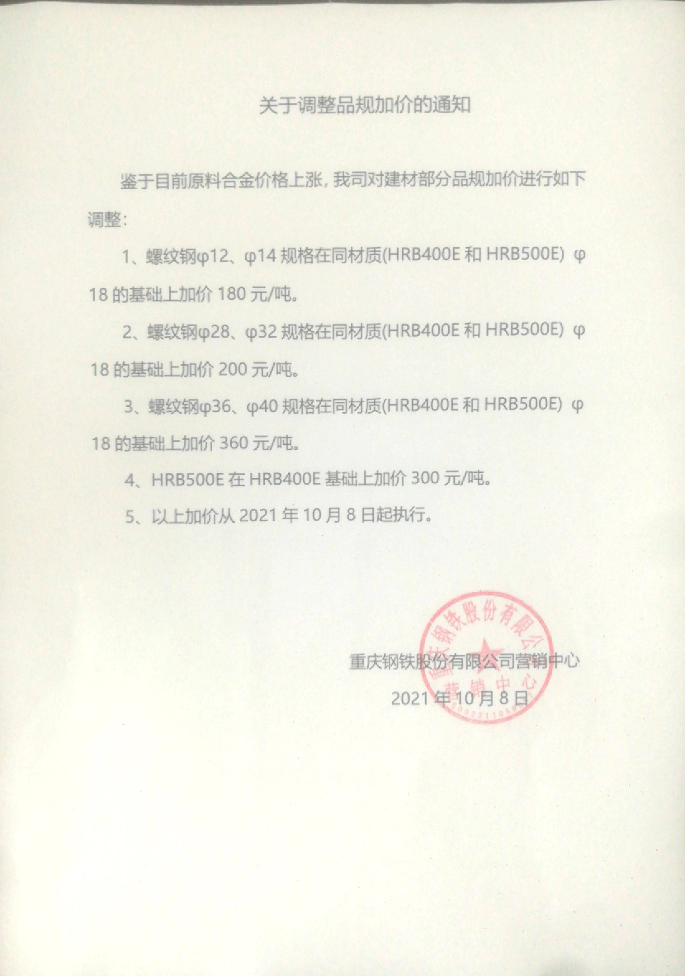 西本訊 10月8日,重鋼螺紋鋼規(guī)格加價調整信息如下: