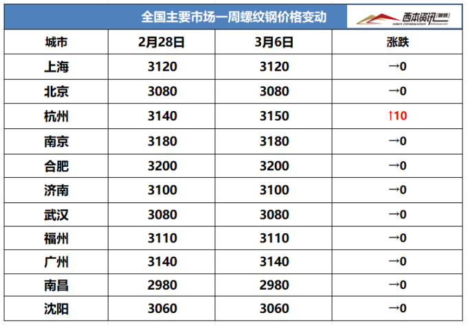 (1)本周國內建筑鋼材行情橫盤整理,截至3月6日,西本指數(shù)報在3420,周環(huán)比持平。