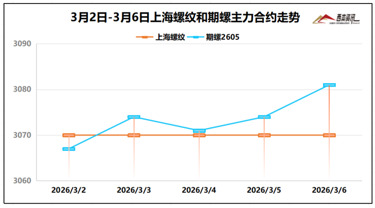 (2)節(jié)后,建筑工程資金偏緊,工程復工速度緩慢,市場交易繼續(xù)清淡,社會庫存持續(xù)累庫,現(xiàn)貨報價缺乏動力,期螺盤面多空交織,截至3月6日,螺紋2605主力合約報在3081,周環(huán)比上漲14。