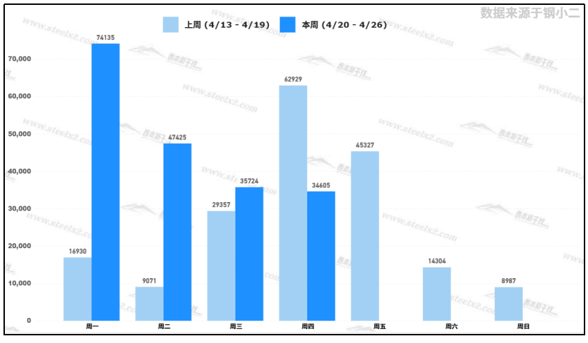 據(jù)鋼小二平臺樣本數(shù)據(jù),4月23日采樣全國工程需求量為34,605噸,較上一個交易日需求下降3%。