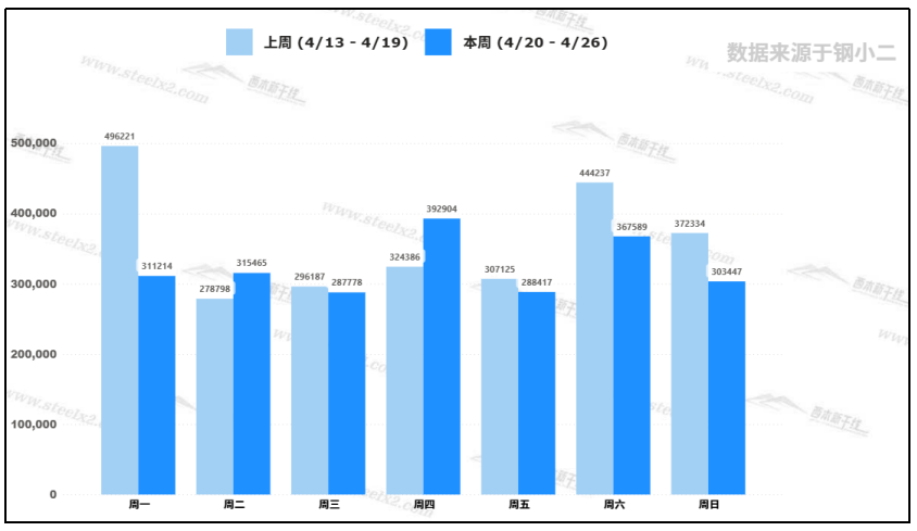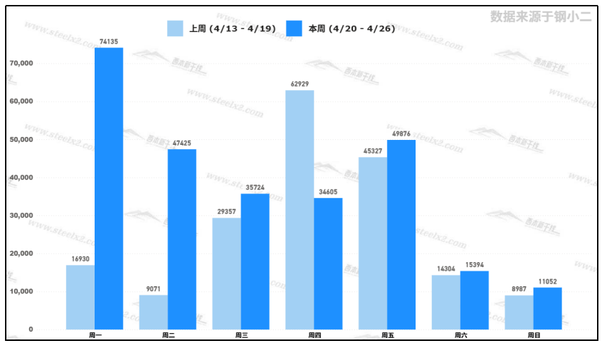 據(jù)鋼小二平臺樣本數(shù)據(jù),4月24日采樣全國工程需求量為49,876噸,較上一個(gè)交易日需求增加44%。