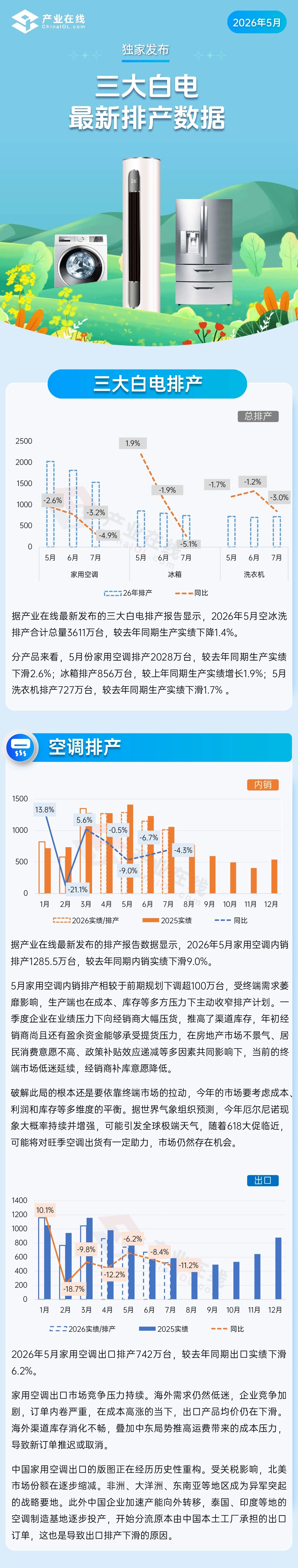 據(jù)產(chǎn)業(yè)在線最新發(fā)布的三大白電排產(chǎn)報(bào)告顯示,2026年5月空冰洗排產(chǎn)合計(jì)總量3611萬臺(tái),較去年同期生產(chǎn)實(shí)績(jī)下降1.4%。