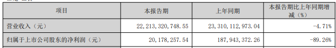 摘要:歸屬于上市公司股東的凈利潤為0.20億元,同比下降89.26%。
